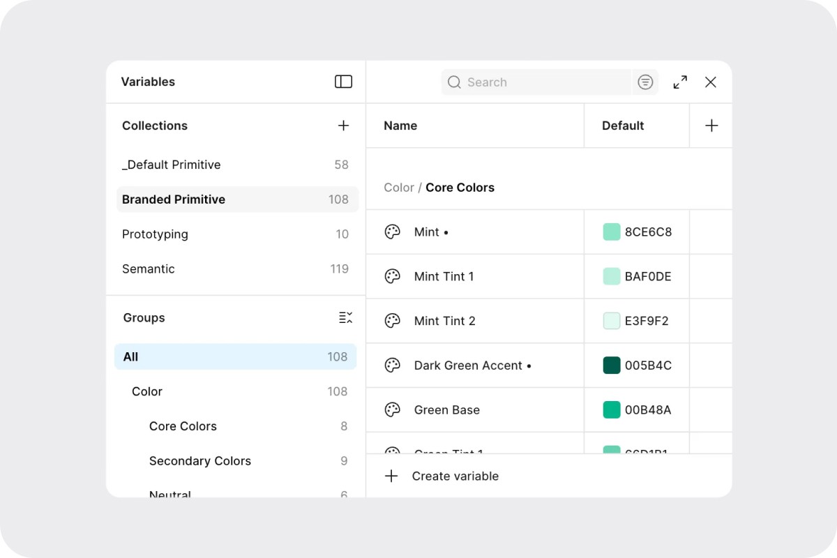 I began by setting up Figma Variables and defining the primitive tokens for color, spacing, typography, and effects. These primitives act as the foundation for all semantic tokens and components, ensuring that any future updates cascade consistently across the entire system.